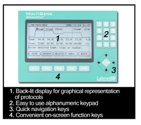 O sistema de programação do termociclador gradiente MultiGene é muito intuitivo. Um grande display de LCD alfanumérico representam os caracteres gráficos e as etapas do programa. Simples, as instruções são guiadas na tela pelo usuário através do processo de programação. O MultiGene Gradiente vem com os os mais comuns protocolos pre-programados os quais facilitam a navegação e entrada de parâmetros com setas chaves e a entrada de novos valores. O máximo de 99 porgramas podem ser armazenados na memória do sistema e organizado em pastas comuns e pastas do usuário, o quais podem ser recuperados por meio de senha de proteção. |