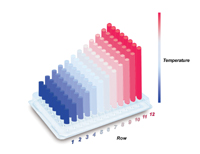 O termo ciclador Multigene Gradiente pode ser programado para operar com temperatura uniforme no bloco para resultados consistentes, ou com temperatura gradiente para optimização de protocolos. O gradiente do MultiGene se espalha horizontalmente permitindo que até 12 temperaturas sejam avaliadas simultaneamente. Para um programa gradiene, a temperatua alta e baixa devem ser ajustadas, o software calcula automaticamente e mostra no display a temperatura de cada fila. |
